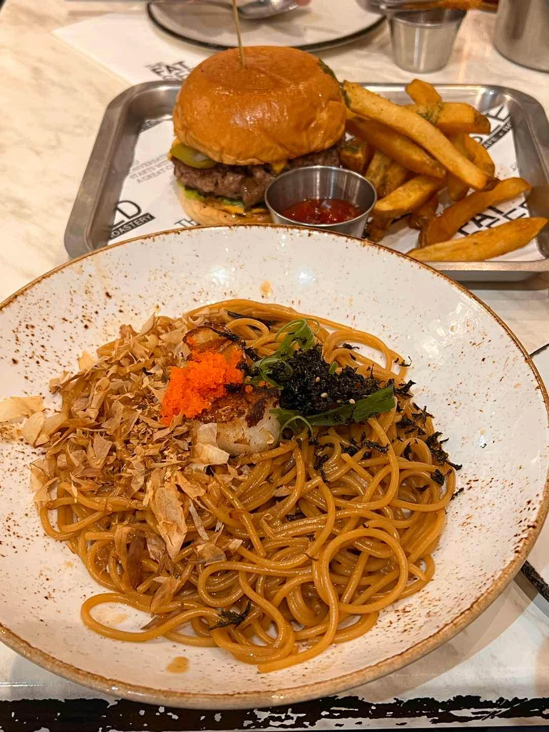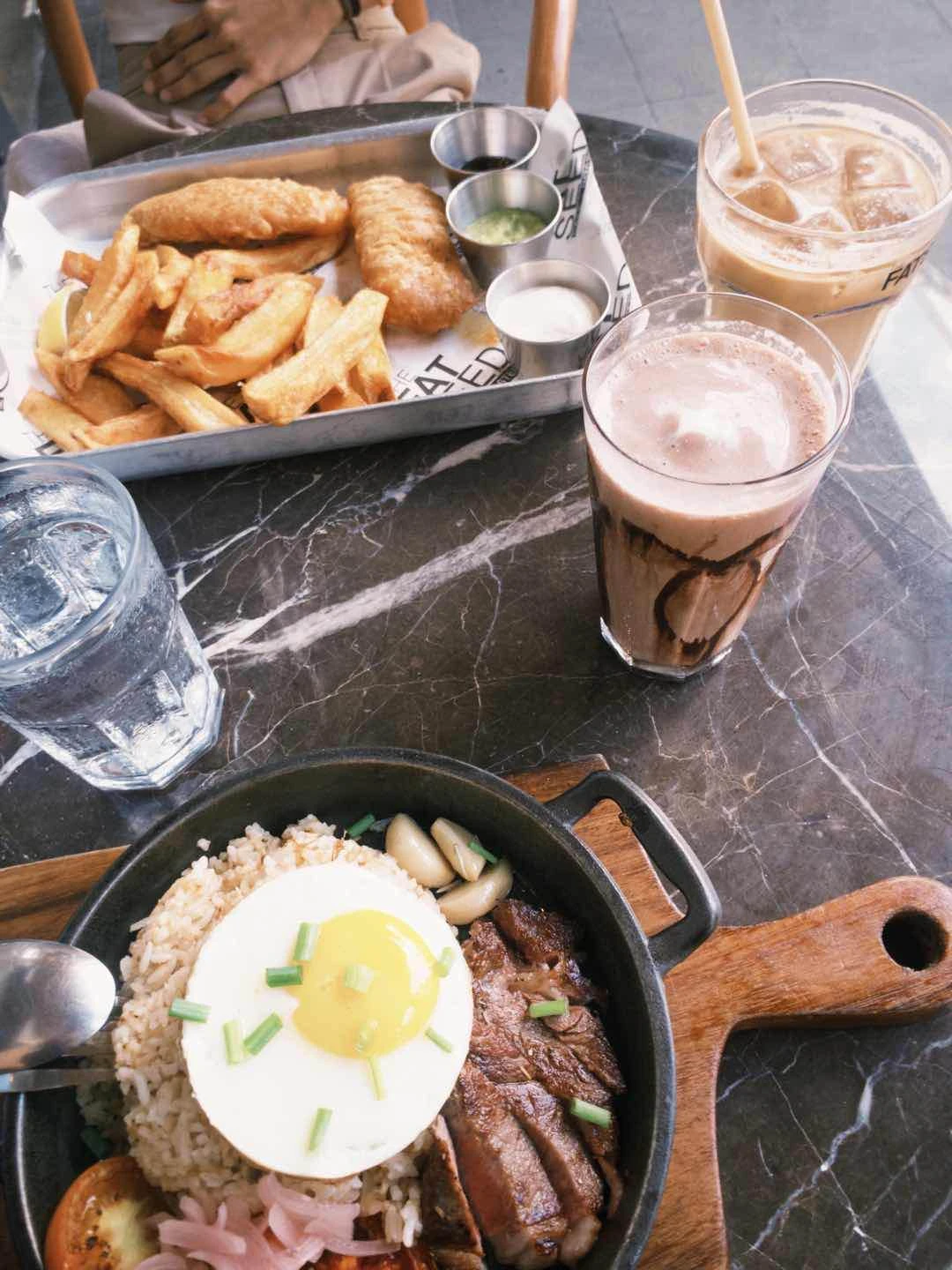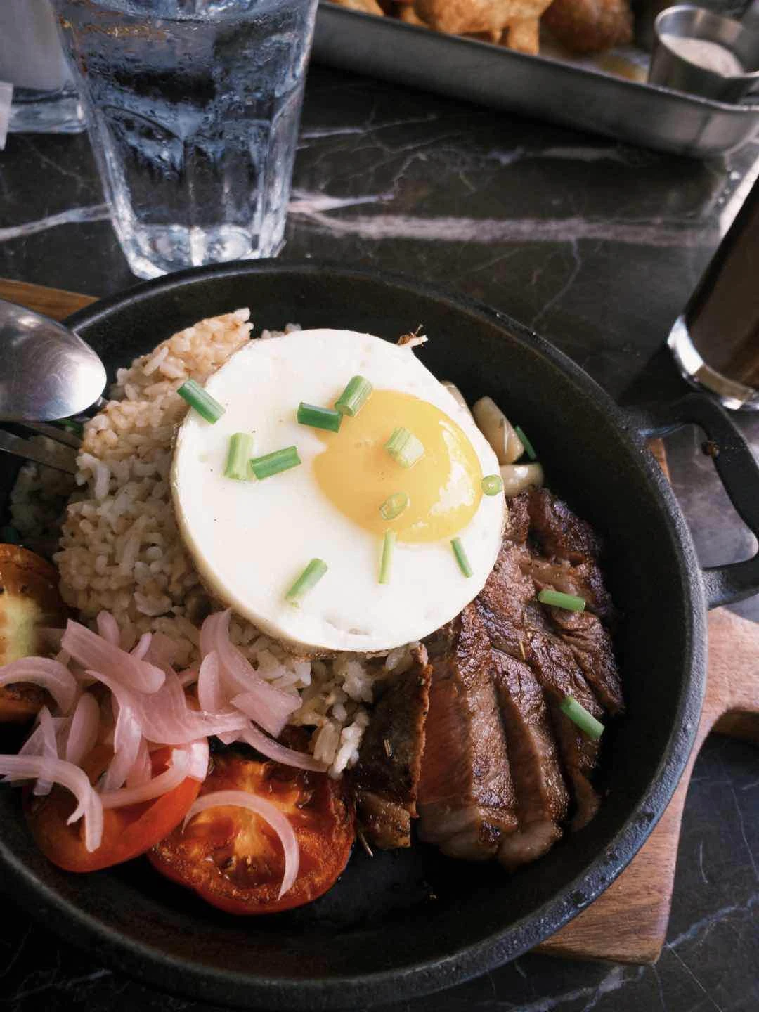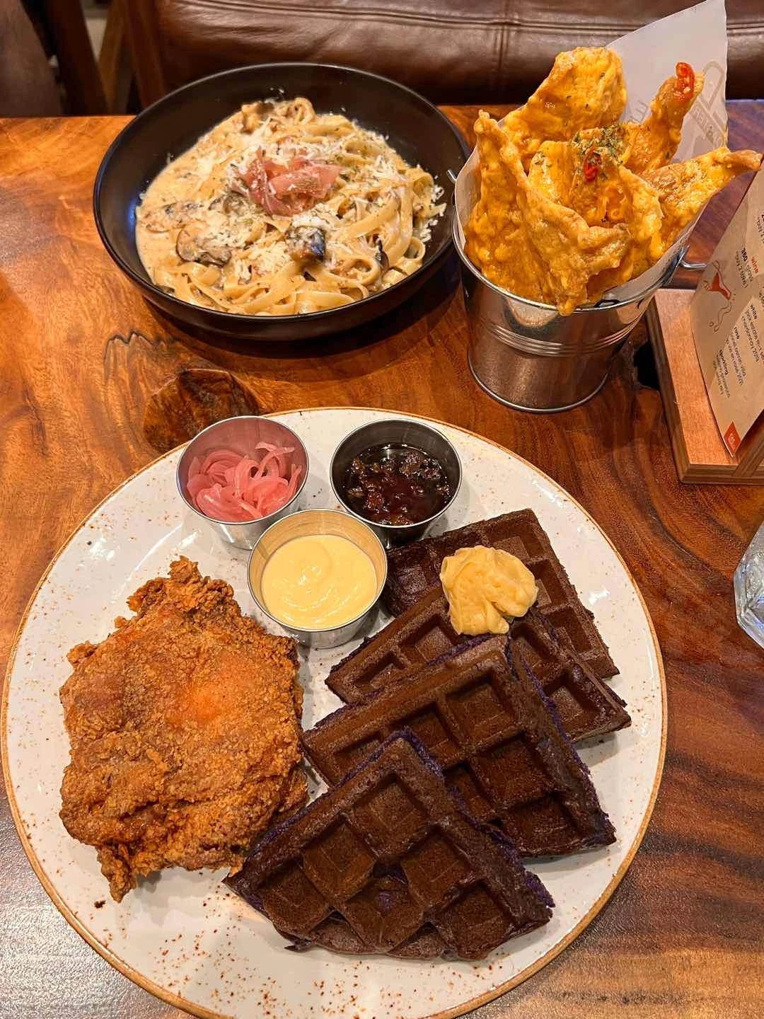 salted egg chicken skin, fries, breakfast steak skillet